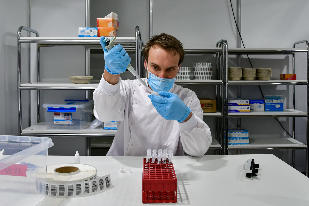Ondanks het gebrek aan voorzieningen op deze locatie is het gelukt om in slechts 2 weken tijd een complete testlocatie uit de grond te stampen. De afgelopen 24 uur is gebruikt om proef te draaien en de processen helemaal te optimaliseren. Vanmiddag om 13.00 is de eerste antigeen sneltest afgenomen. Deze sneltesten worden in het eigen, aangrenzende laboratorium geanalyseerd, waardoor de uitslag heel snel beschikbaar is. Ook hierin is dit testcentrum uniek.